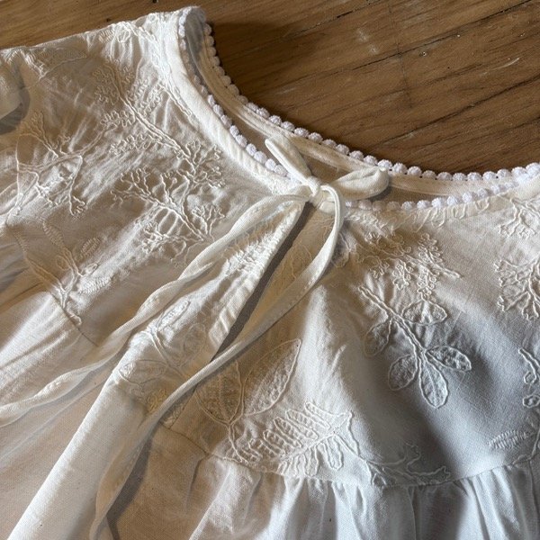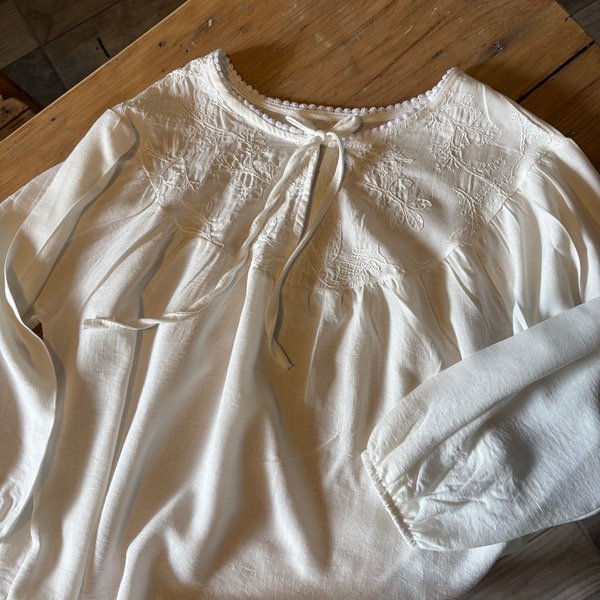 Blusa con bordado clásico y mangas 3/4, ideal para lucir con chalecos o sola.