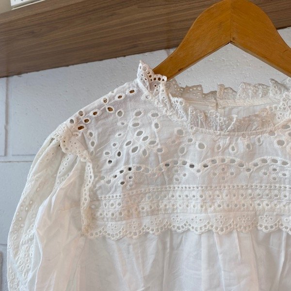 El cuello puntillado y las mangas abullonadas le dan un toque romántico y elegante.